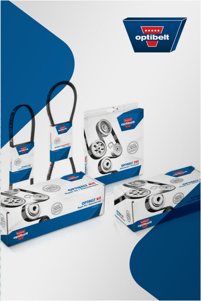 La gama de correas OPTIBELT incluye correas trapeciales, dentadas de caucho, dentadas de poliuretano, correas estriadas o correas múltiples, además de accesorios y complementos.